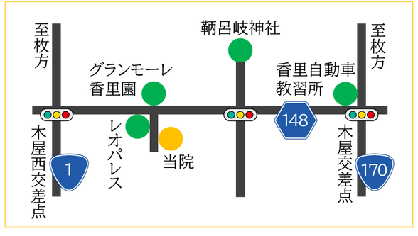 当院は、グランモーレ香里園の真向かいにございます。グランモーレ香里園を目印に、道を挟んだ反対側にあります。